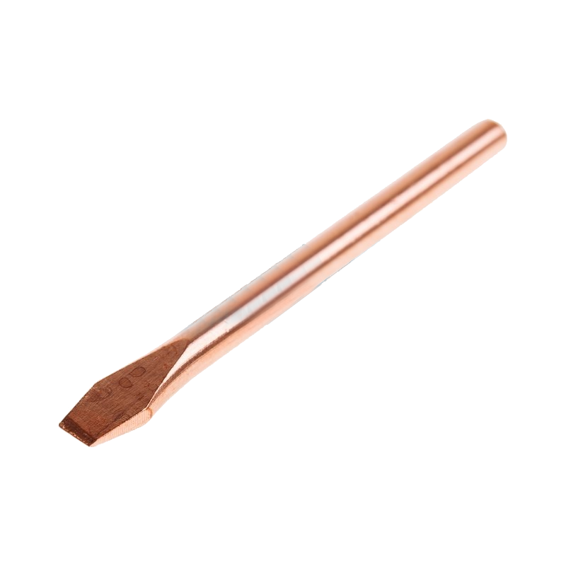 Жало медное представляет собой цилиндрический стержень, имеющий с одного конца один из множества типов форм. Медь — это идеальный материал для изготовления паяльного жала с точки зрения теплопроводности. Кроме этого, медное жало имеет отличную теплоемкость. Подавляющее большинство паяльников комплектуются именно такими наконечниками.