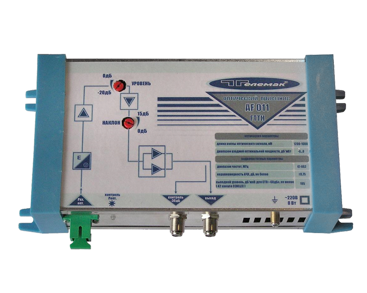 Местное питание, система АРУ, импульсный БП, индикация оптической мощности на основе семисегментного индикатора, -8 - 0 дБм.