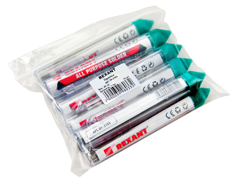 Припой с канифолью 20 г Rexant представляет собой проволоку (диаметром 1 мм) из сплава олова (60%) и свинца (40%). Используется в пайке для соединения деталей между собой и позволяет создать герметичный, механически прочный (устойчивый) шов. Нагреваясь до температуры плавления (183-188 С) припой: расплавляется, смачивает спаиваемый металл и, растекаясь по нему - заполняет место между соединяемыми деталями.