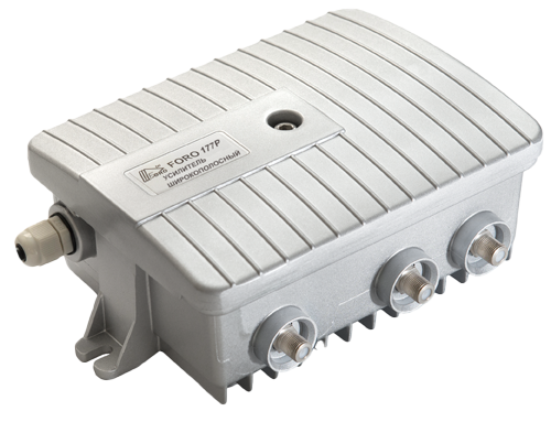Мощный широкополосный усилитель с выходным уровнем - 128 дБмкВ (по DIN45004B, при искажениях 3-го порядка -60 дБ) реализован во влагозащитном литом корпусе (класс защиты IP66 по МЭК529) имеет встроенный источник дистанционного питания по коаксиальному кабелю переменным напряжением 25…95В.